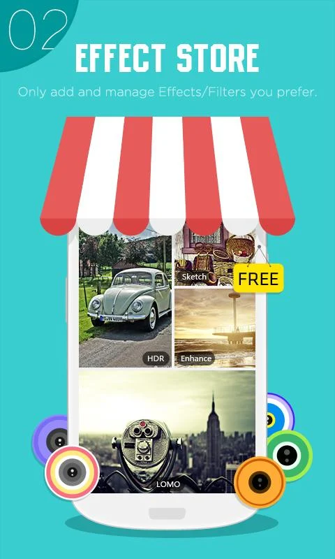 Hơn 100 hiệu ứng tuyệt vời của Camera360 có thể được tìm thấy trong cửa hàng có hiệu lực mới, nơi bạn có thể thêm và quản lý hiệu quả ưa thích của riêng bạn. Thời gian này 13 hiệu ứng mới gia nhập gia đình. Phần quan trọng nhất là tất cả miễn phí!